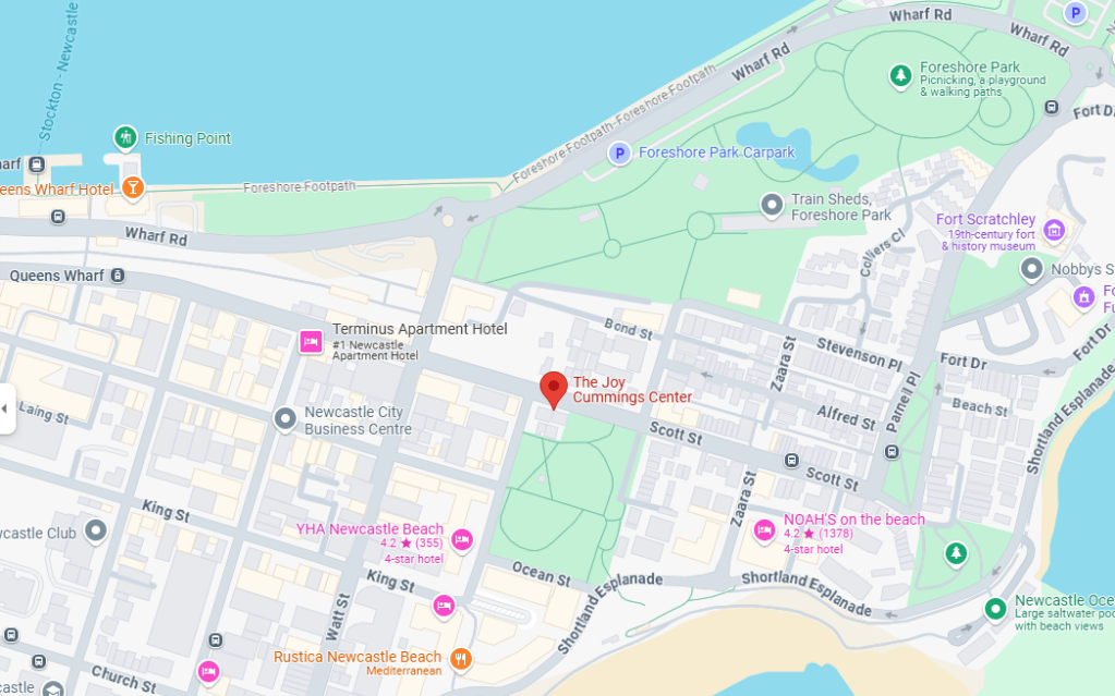 Our Monday classes for children are run at the Joy Cummings Centre, 63 Scott St, Newcastle NSW. The Centre is just behind the Newcastle Beach Tram stop and few minutes walk from Newcastle Beach and right in the Pacific Park with nearby options available for parking.